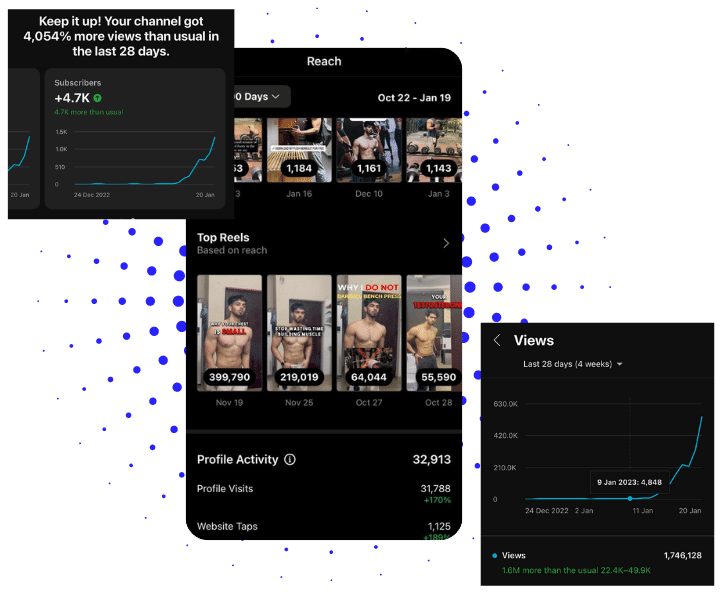 We took over the short-form content for a fitness coach and with high-impact video editing, increased the views on YouTube by 4054% and got 170% more profile visits on Instagram with multiple viral shorts and reels.
